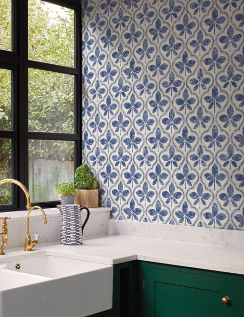 A five-leaf stem is captured in the ogee tile; open patio style of pattern Sevilla.