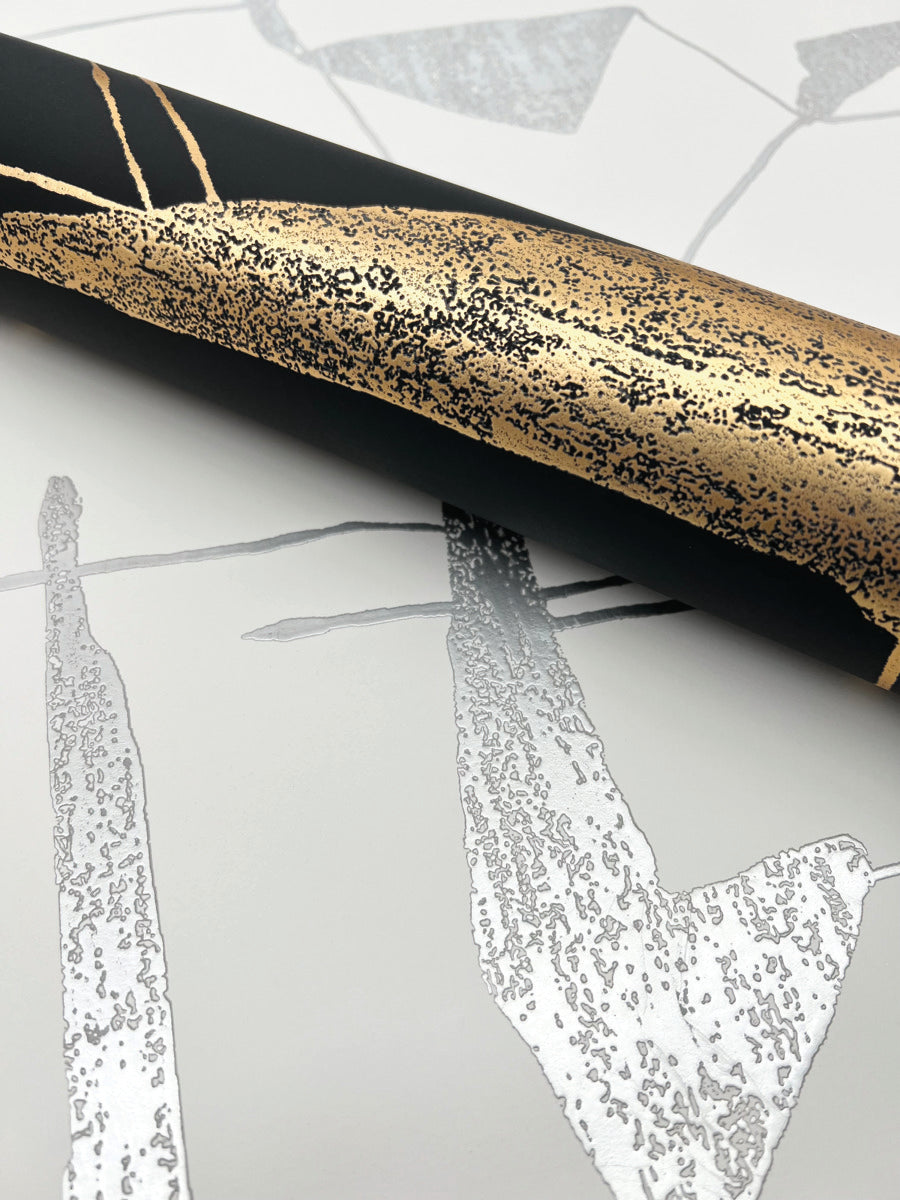 An artistic Symbolist interpretation of geometric form; modern metallic pattern Abstract Geo uniquely defines its abstract shape; shown in midnight black with gold metallic. This Abstract Geo Wallpaper measures approximately 27 inches wide by 26.9 feet long; measuring approximately 60.5 square feet per roll. The long awaited follow-up to the popular first release; Modern Metals Second Edition energizes contemporary spaces with charismatic visual artistry defined by the allure of luminous metallic.