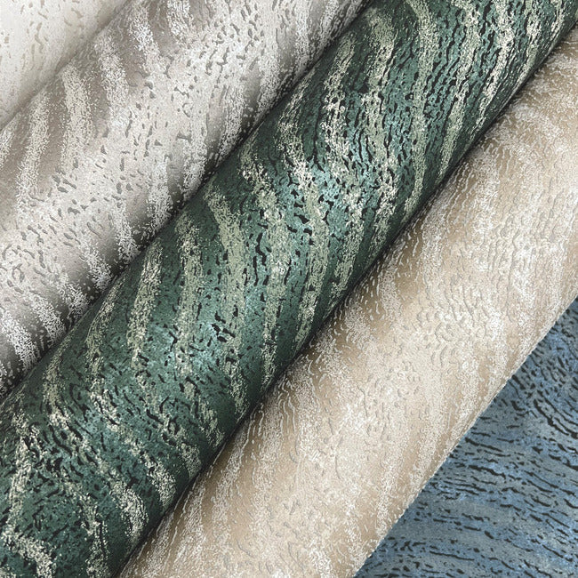 Tree rings and woodgrain becomes a sinuous story of today’s romance with natural Modern Wood when combined with touches of raised metallic, shown in indigo blue.