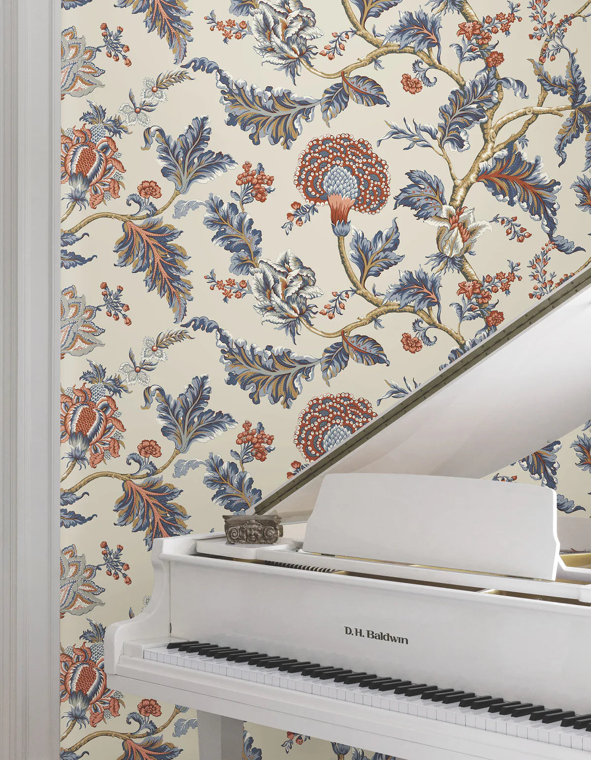 Opulent leaves and lush, multi-layered flowers decorate winding branches in Monroe's impressively scaled Jacobean design. Seen here in a palette of vermilion, persimmon, golden ochre, lapis, sky blue, pale grey, alabaster, and beige. This Monroe Wallpaper measures approximately 54 inches wide by 27 feet long, measuring approximately 121.5 square feet per roll. Traditional and timeless meets modern refinement, with artfully crafted designs redefined in striking color palettes.