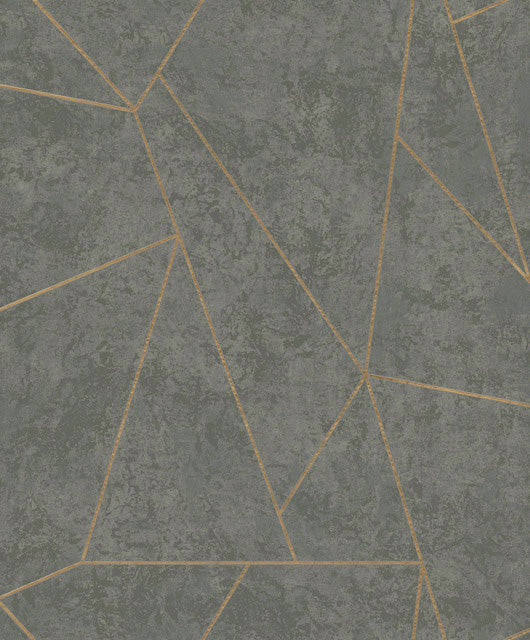 Fractured metallic lines create a contemporary geometric of irregular lines and angles in the Nazca pattern; shown in dark gray with gold. This Nazca Wallpaper measures approximately 20.8 inches wide by 33 feet long; measuring approximately 57.2 square feet per roll. The long awaited follow-up to the popular first release; Modern Metals Second Edition energizes contemporary spaces with charismatic visual artistry defined by the allure of luminous metallic.