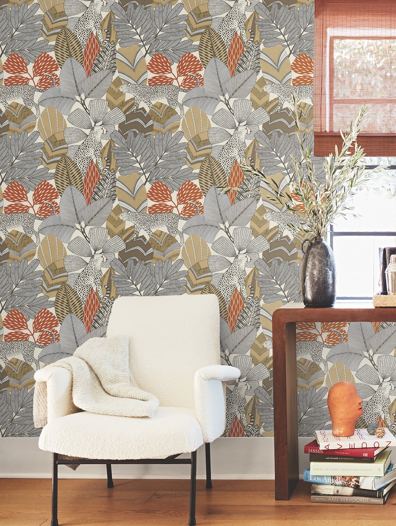 Wildcats prowl through dense, richly patterned foliage in fiercely sophisticated design Namiri. Featured here in a palette of ochre, brown, orange, black, and taupe. This Namiri Wallpaper measures approximately 27 inches wide by 27 feet long, measuring approximately 60.8 square feet per roll. The rich global heritage of timeless relics and hand-crafted naturals are artfully blended in this curated collection of culturally inspired designs.