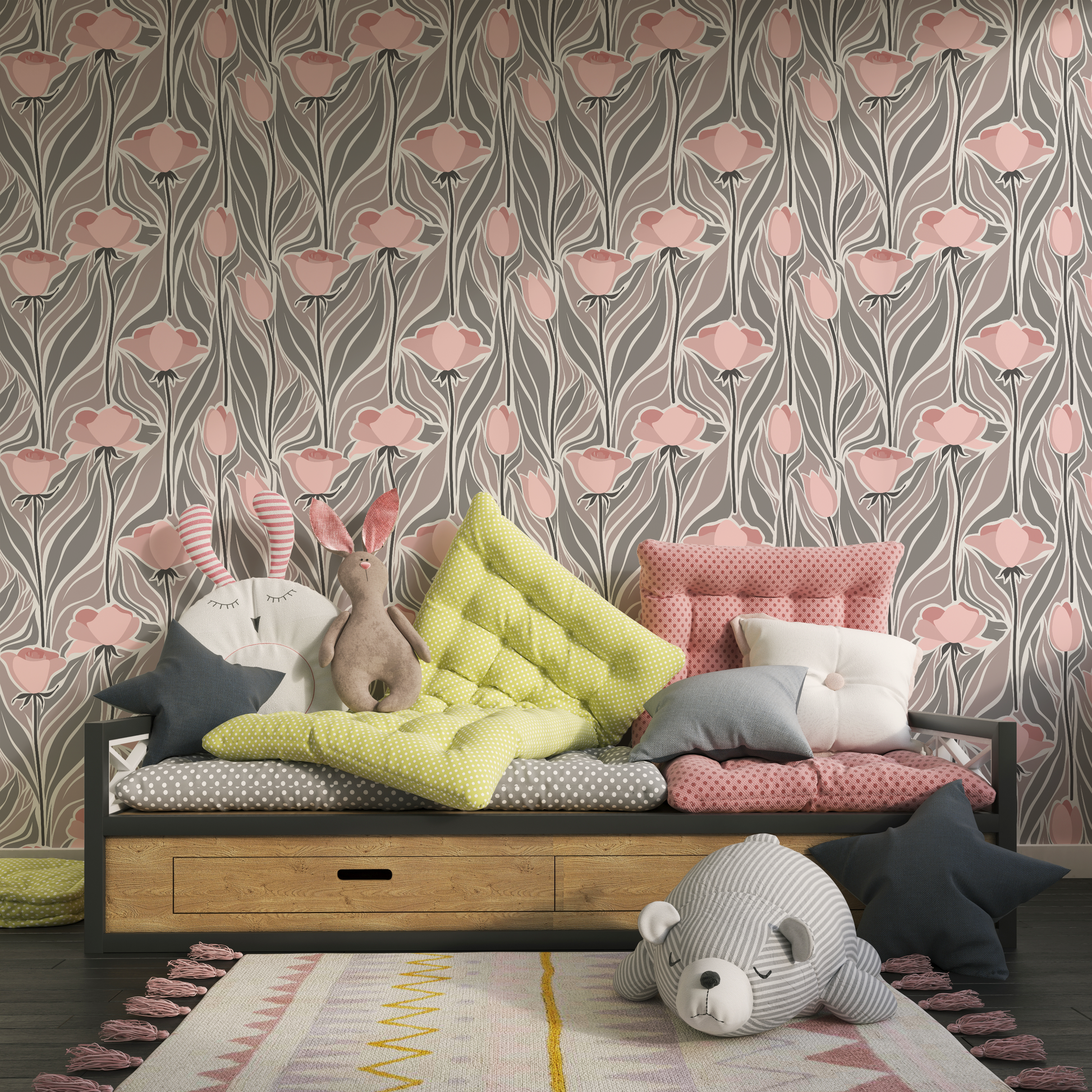 Introducing the Pink Grey floral wallpaper – perfect for adding a touch of nature to a child's bedroom. Designed with vivid colors and a beautiful floral print, this wallpaper is sure to brighten up any room for years to come. With non-toxic, safe material, it's an ideal choice for any family.