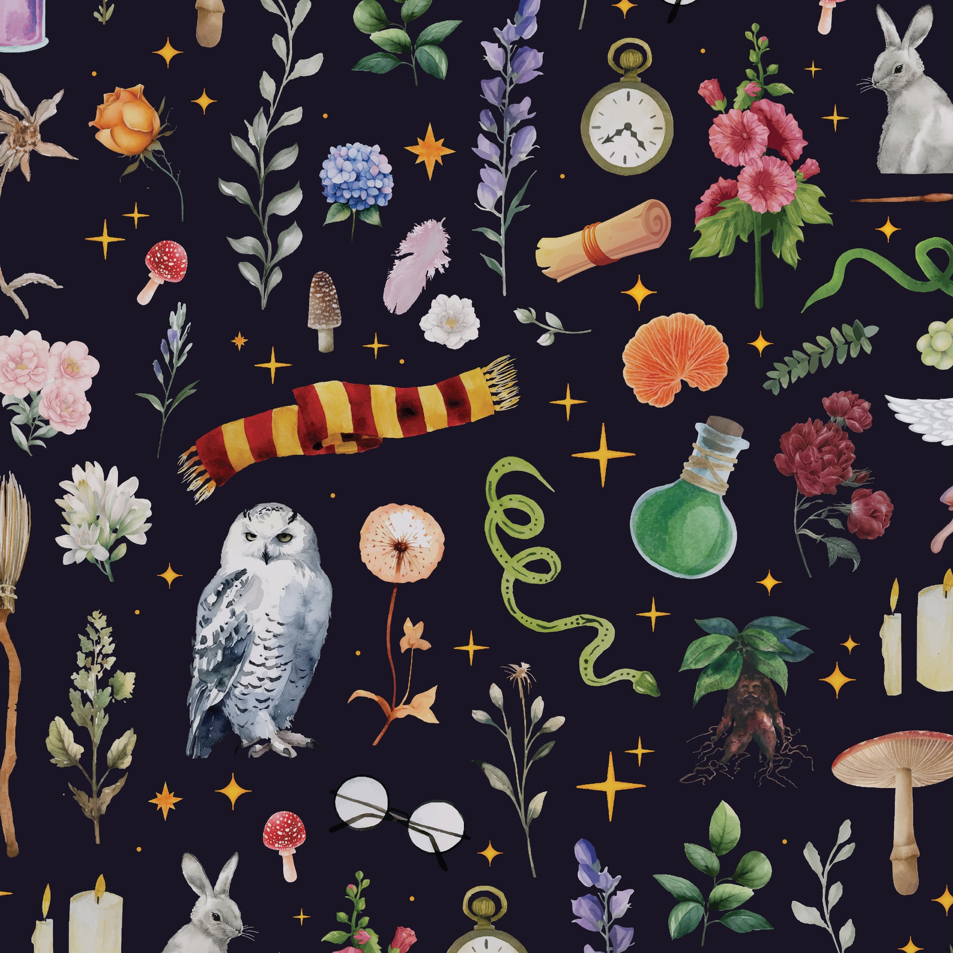 Step into a world where nature and magic intertwine with "Wizard Herbology." This enchanting wallpaper captures the essence of a wizard's botanical sanctuary, where every plant and potion ingredient tells a story of ancient lore and mystical powers. Delicate flowers, rare herbs, and curious fungi are artfully arranged alongside magical artifacts, each one a key to unlocking the secrets of the arcane!